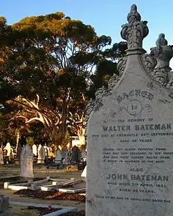 Bateman sold out of the family business J. & W. Bateman Ltd in 1872, and died unmarried in Fremantle on 24 September 1882.[1] He was buried in the Fremantle Cemetery in Alma and Skinner Streets where his father is also buried.[2] His gravestone is now in the main Fremantle Cemetery.