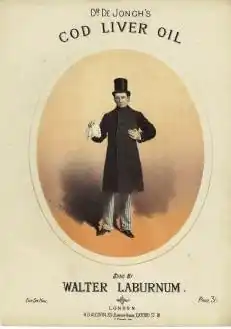 Born in Hendon, Laburnum worked as a beer and wine seller before becoming a professional performer in the 1870s. He became well known as a singer of "coster songs",[1] and for parodying the style of popular lions comiques, in particular George Leybourne, with songs such as "Fashionable Fred".[2] Leybourne was known for driving around the capital in a carriage drawn by four white ponies; Laburnum used a cart drawn by four donkeys. Laburnum also sang "Dr. De Jongh's Cod Liver Oil", mocking the use of fashionable new medical remedies.[3] He was known as "The Star of the East", a reference to the East End of London.[4]