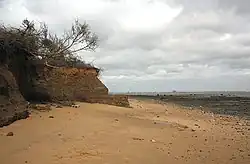 The cliffs themselves are a Site of Special Scientific Interest (SSSI), the base of which is London Clay (54 million years old) which is overlaid with a 2-million-year-old sandy deposit of Red Crag. This sandy deposit contains many fossils including bivalve and gastropod shells, sharks' teeth and whale bones. The clay base is considered one of the best sites for pyritised fossils (mainly wood), and for bird bones (which are very rare);[10] in 1998, David Attenborough estimated that over 600 specimens of bird fossil had been found at the site.[11]