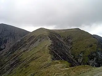 Wandope is not prominent in views from below[1] and from most directions appears subservient to its higher neighbours. The connection to Crag Hill is the broad plateau of Wandope Moss, sloping down easily to the west. On the opposite side is the striking feature of Addacomb Hole. This symmetrical hanging valley resembles a half crater, its headwall being 700 feet (210 m) high.