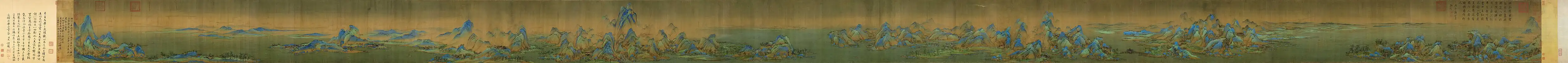 The scroll was done in the blue-green landscape technique of the Sui and Tang dynasties,[5] using azurite and malachite colours.[8] Zhan Ziqian of Sui, Li Sixun and Li Zhaodao, Zhang Zao, and Wang Wei of Tang are famous painters who worked in this genre. In the time of Emperor Huizong, blue-green paintings became a medium used to "express literary ideals".[8] Wang Ximeng apparently "boldly blended the north and south style" in his work.[10] With time the silk became darker, but colours are still bright.[10] Patricia Buckley Ebrey writes about Wang's style that the choice of blue and green colours can be seen as "a gesture of respect for the past"; besides colours, he borrows other Tang dynasty features - carefully drawn lines, and "perhaps the decision to feature people traveling through the landscape on foot, on horse back, and in boats". She notes that his compositional methods are "entirely" Song: "mountains and trees are not outlined, the hills are volumetric, and the lighting effects are dramatic".[6] Yuan dynasty Grand Secretariat Pu Guang wrote that the scroll is "a unique piece over a thousand years, comparable to the lone moon in a sky of stars".[8]