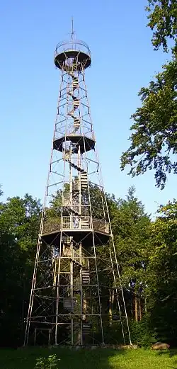 Wanne observation tower is one of the oldest lattice towers in the world. It was built in 1888 by the observation tower cooperative on the 778-meter-high (2,552 ft) Wanne mountain tub east of Villingen, in the Schwarzwald-Baar district in southern Baden-Württemberg, Germany. It was erected by bell foundry Grueninger of Villingen. The 30-meter-high (98 ft) tower has three platforms and is remarkable for its uncommon design, as it has an octagonal cross section.