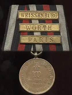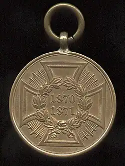The War Commemorative Medal of 1870–1871 (German: Kriegsdenkmünze für die Feldzüge 1870–1871) is a campaign medal presented by Kaiser William I in his capacity as King of Prussia. The medal was presented to commemorate service in the Franco Prussian War. The medal was presented to members of the united German armies. The medal was presented for combat service in bronze, and non-combat service in steel. Each version bore minor differences in inscription and design. Clasps were authorized on the 25th anniversary of the German victory, to commemorate selected battles.