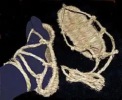 Rice straw is the common and traditional material for weaving waraji.[2] Long straw (not broken by the processing methods) must be beaten to soften the fibers before use.[6] Most other ropemaking fibers can also be used, such as cotton, hemp, palm fibers, or even strips of rag.[2][6] The straps of the waraji might be covered, often with paper.[1] Cardboard soles are used on some modern commercial designs.[7]