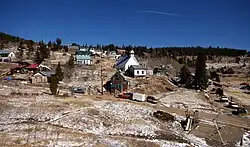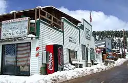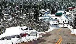 The town was named for Calvin Ward, who prospected a claim in 1860 on the site known as Miser's Dream.[6] The town boomed the following year with the discovery by Cyrus W. Deardorff of the Columbia vein. Over the next several decades the population fluctuated, growing from several hundred to several thousand before declining once again. The mines in the area remained profitable for many decades, with one mine eventually producing over 2 million troy ounces (62 t) of silver. A post office with the name Ward District was established January 13, 1863; the name was changed to Ward, September 11, 1894.[7] The city was incorporated in June 1896. The railroad reached the area in 1898, arriving over the Whiplash and Switzerland Trail, which climbed over 4,000 feet (1,200 m) from Boulder over the course of 26 miles (42 km). In January 1900 over 50 buildings were destroyed by a devastating fire, although the profitability of the mines led to the immediate rebuilding of the town. The town was largely deserted by the 1920s, but the construction of the Peak-to-Peak Highway in the 1930s led to a revival of the town. During WWII the town's year-round population dropped to four people. Then, in the 1960s, the town's population jumped from between 10 and 20 year-round residents to well over 100 due to the town's interest to hippies.
