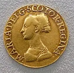 Some of Mary's Scottish coinage was designed by John Acheson, who visited the court in France in 1553.[46] Coins including the gold ryal show her in profile, wearing a caul or hairnet with two jewelled bands.[47] Several sets of these bands appear in her jewel inventories listed in French in pairs as bordures or brodures, the bordure de touret at the forehead and the longer bordure d'oriellette over the head.[48] In England, the equivalent accessories for French hoods were called upper and nether billiments.[49]