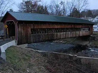 Ware–Hardwick Covered Bridge is a historic covered bridge spanning the Ware River on Old Gilbertville Road and Bridge Street in Ware and the village of Gilbertville within Hardwick, Massachusetts. It is one of a small number of surviving 19th-century covered bridges in the state. The bridge was built in 1886, extensively rebuilt in 1986–1987, and was closed in 2002 due to structural issues and a limited carrying capacity. The bridge reopened in October 2010 and no longer has a weight limit according to MassDOT. It was listed on the National Register of Historic Places in 1986.[1]