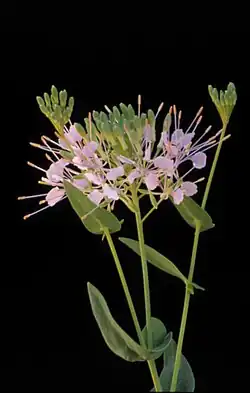 This annual herb grows up to 70 or 80 centimeters in height. The leaves vary in shape, but they are always clasping: their bases encircle the stem, forming a ring around it. They sometimes have two lobes pointing in the opposite direction of the tip of the leaf blade. The leaves are up to 4 centimeters long. The inflorescence is a raceme of white, pink, or purplish flowers. The petals are somewhat spoon-shaped, with a fan-shaped blade narrowing into a very thin claw, the stalk that attaches to the flower. At the center are six long stamens which, at up to 1.5 centimeters in length, project far out of the flower. The fruit is a thin, narrow silique up to 7.5 centimeters long.[1][2] Blooming occurs in August through October.[2]