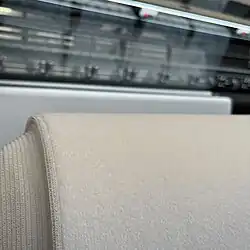 This is created through a warp-knitting thread system, which is fixed on the reverse side of the fabric with a sinker loop, and a weft thread layer.[10] A needle with the warp thread passes through the material, which requires the warp and knitting threads to be moving both parallel and perpendicular to the vertical/warp direction of the stitch-bonding machine.[11] Stitch-bonded fabrics are currently being used in such fields as wind energy generation and aviation.[10] Research is currently being conducted into the usage and benefits of stitch-bonded fabrics as a way to reinforce concrete. Fabrics produced with this process offer the potential of using "sensitive fiber materials such as glass and carbon with only little damage, non-crimp fiber orientation and variable distance between threads".[10]