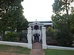 Warrawee is a vernacular style residence, with a most impressive facade and a full sub-floor. The twelve foot wide verandahs have elegant cast-iron balustrading, and brackets and are lined underneath with ripple iron. The verandah portico with its intricate fretwork pediment, groups of columns, landing, gates and iron lace is quite spectacular, complemented by the twin curved stairs with their Scottish thistles in cast-iron panels.[1]