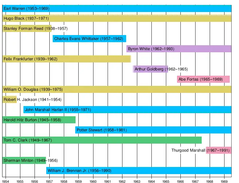 With the exception of the desegregation decisions, few decisions were unanimous. The eminent scholar Justice John Marshall Harlan II took Frankfurter's place as the Court's self-constraint spokesman, often joined by Potter Stewart and Byron R. White. But with the appointment of Thurgood Marshall, the first black justice (as well as the first non-white justice), and Abe Fortas (replacing Goldberg), Warren could count on six votes in most cases.[38]