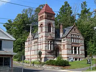 The library is set on the north side of Main Street (Massachusetts Routes 19 and 67), just east of the town's central business district and west of the town common. It is a 2+1⁄2-story structure, built of granite with brownstone trim, with a slate roof and a granite foundation. Its front facade is asymmetrically arranged into three sections, with a three-story pyramidally-roofed tower on the left, the main entrance in the center, and a large projecting gable section on the right. Courses of granite are periodically interspersed with bands of brownstone that extend across and around the building. The tower has a projecting bay window, above which is a round-arch opening with a pair of round-arch windows within, topped by an oculus. An arcade of small arched openings bands across the tower between that opening and the roof.[2]