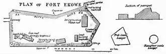 On 28 January 1879, the column received Lord Chelmsford's announcement that he was forced, on account of the Isandhlwana disaster, to retire to the frontier. Full discretion was given to Pearson to hold his position or retire to the Tugela. A majority of a council of war was in favour of retreat, when Wynne, mentioning that retreat would be hazardous, and its morale effect at such a juncture most detrimental, succeeded with the support of Colonel Walker and Captain H. G. MacGregor in securing a decision to remain at Ekowe.[3] The construction of the fort continued with Wynne building a moat, drawbridge, gate and loopholed palisade.[6]