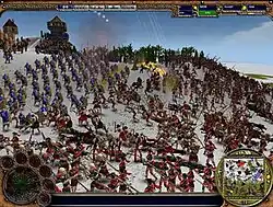 There are seven broad classes that units may be classified by, these are: Light (mostly ranged), Heavy (melee), Cavalry, Siege, reconnaissance (scouts), demonic, and special. Though some units might be classed as "demonic" or "special", they all count as another type of unit as well. For example, a "gibbering hoard" is a daemon, but also counts as light infantry. All of these unit types are effective and vulnerable to the other classes such as demonic being weak to special and heavy cavalry being weak against heavy infantry head-on.[5] These handicaps require use of terrain, unit formation, positioning, and modus of attack to be considered for units to overcome their inherent weakness'. Units are built at a base level but can be trained for better effectiveness both in battle through the use of attack dummies.[4] Unlike most real time strategy games ranged units have a set amount of ammunition at their disposal that must be replenished by supply carts or certain buildings lest their rate of fire suffer.[4] There are also naval units like attack ships and trade cogs built at a port by water yet can only be built and used in multiplayer games.[6]