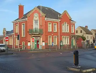 The new building was designed in the neoclassical style, built in red brick with stone dressings at a cost of £8,000 and was officially opened on 13 July 1933.[8] The design involved a symmetrical main frontage at the corner of Wood Street and Church Street. It featured a deeply recessed doorway flanked by pilasters and brackets supporting a wrought iron balcony; there was a French door on the first floor and the whole structure was surmounted by an open pediment with a clock in a hexagonal-shaped frame in the tympanum. The Wood Street elevation extended back ten bays with a pedimented section, which slightly projected forward, spanning the eighth and ninth bays, while the Church Street elevation extended back four bays with a pedimented section, which slightly projected forward, in the third bay. Internally, the principal rooms were a council chamber, a library and a maternity and child welfare centre.[8] The council chamber was fitted out with fine wooden panelling.[9]
