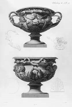 - ^ The earliest reductions of the Warwick Vase were in the form of silver ice-pails made by Paul Storr for the Prince Regent in 1812; David Udy concluded that Stoor had worked from Piranesi's etchings (Udy, "Piranesi's Vasi: the English silversmith and his patrons", The Burlington Magazine, 120 [December 1978:fig. 37]).