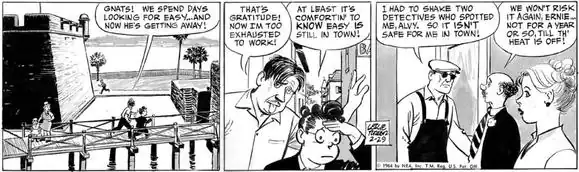 After Crane’s departure, control of the strip then passed to Crane’s assistant, Leslie Turner, who had ghosted on the daily strip since 1937.[2] Turner's assistant Walt Scott drew the Sunday page. Easy was in the Army by that time, and Tubbs had an increasingly unimportant role, so both daily and Sunday strips displayed the name Captain Easy in 1949 (with Wash Tubbs fading away).