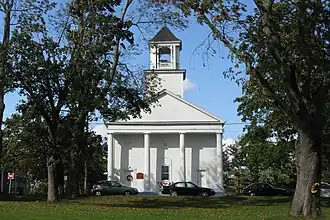 The Washburn Square–Leicester Common Historic District encompasses the historic civic heart of Leicester, Massachusetts. It includes Washburn Square, as the town common is called; the buildings along its perimeter; and the properties along Main Street extending east along Main Street to its junction with Henshaw Street. It includes the 1939 Leicester Town Hall, Becker College's 1962 Swan Library, a Victorian Gothic Revival First Congregational Church (a rarity due to its comparatively late construction date, 1901) and the 1834 Leicester Unitarian Church (originally known as the Second Congregational Church). The south side of Washburn Square (named for Leicester native son Governor Emory Washburn) is lined with stately homes that now are almost all owned by Becker College.[2]