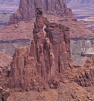 Washer Woman is a 500-foot (150-meter) tall sandstone arch and tower located in the Island in the Sky District of Canyonlands National Park, in San Juan County, Utah. It is situated 300 feet northwest of the slightly higher Monster Tower. Washer Woman is so named because the feature gives the appearance of a washerwoman bent over a washtub.[4] This geographical feature's name was officially adopted in 1986 by the U.S. Board on Geographic Names after previously having similar names such as Washer-Woman Arch and The Washer Woman.[4] Washer Woman and Monster Tower are an eroded fin composed of Wingate Sandstone, which is the remains of wind-borne sand dunes deposited approximately 200 million years ago in the Late Triassic. Airport Tower is set 1.6 mi (2.6 km) to the east, and Mesa Arch is situated 1.5 mi (2.4 km) to the west.[1] A short hike to Mesa Arch provides the easiest view of Washer Woman. Access to this formation is via the four-wheel drive White Rim Road, which is the other option to see it. The top of this geological formation rises 1,300 feet above the road in approximately one mile. Precipitation runoff from Washer Woman drains southeast into the nearby Colorado River via Buck Canyon.