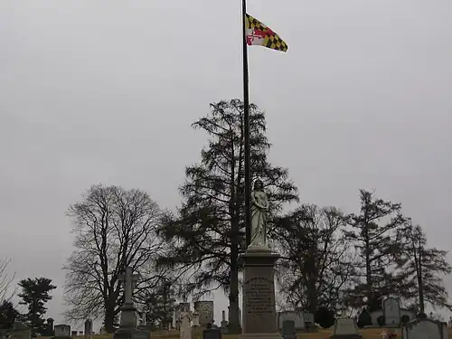 The Statue of Hope Monument was placed on February 28, 1877, and dedicated on June 15, 1877. The dedication speaker was General Fitzhugh Lee, nephew of Robert E. Lee, and himself a cavalry general officer in the American Civil War. The monument inscription reads: "The State of Maryland has provided this cemetery and erected this monument to perpetuate the memory of the Confederate dead who fell in the Battles of Antietam and South Mountain." Standing 19 feet (5.8 m) high, overlooks the section of the 110 acres (45 ha) Rose Hill Cemetery where the Confederate dead are buried.[5] On September 3, 1961, the monument was rededicated with former President Dwight D. Eisenhower as the guest speaker.[2]