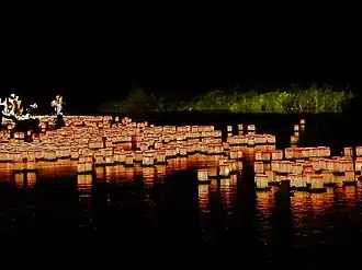 Tōrō nagashi (灯籠流し or 灯篭流し) is a ceremony in which participants float paper lanterns down a river; tōrō is the Japanese word for "lantern," while nagashi means "cruise" or "flow." This activity is traditionally performed on the final evening of the Bon Festival in the belief that it will help to guide the souls of the departed to the spirit world. The Bon Festival takes place on the thirteenth to sixteenth of August or July, depending on the calendar used. The peaceful custom is a gesture of respect for those who have died and gives participants a moment to think about their ancestors, loved ones or even past pets.[2]