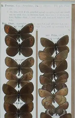 E pronoe Esp. (= arachne Hbn.) (37 c). Dark black -brown, with a red -brown band which is anteriorly broader and posteriorly narrower and bears costally 2 white-centred ocelli and towards the hindmargin an additional smaller one. The band of the hindwing consists of 3 rounded russet-brown spots with black eye-dots which have occasionally white pupils. Underside of the forewing sombre red-brown the band lighter and distinctly contrasting; the distal margin and apex dusted with bluish grey. The hindwing beneath bluish- or ashy- grey with black -brown dusting; the centre traversed by a curved, posteriorly broadly dentate, almost uniformly brown band which sharply borders the distal area. In the latter there are one or two black blind ocelli. The female is much lighter above and beneath, with the markings more prominent than in the male, the ocelli being larger and the base and submarginal band of the hindwing beneath light white-grey, the brown middle hand contrasting sharply. Distributed over the whole Alps, occurring also in the Apennines, Pyrenees, Carpathian Mts., South and South-West Russia and the southern slopes of the Caucasus. - In pitho Hbn (37c), which represents the species in the Swiss Alps and the southern Jura, the markings of the upperside are either entirely absent or there is only a reddish tint as a faint remnant of the same, the 2 ocelli near the apex are small and have minute white pupils. Some species [Sic] have no ocelli, being simply dark black-brown with some violet sheen. Underside as in the first described form - In the form almangoviae Stgr. the subcostal ocelli, though present in the brown band, are without distinct white pupils, those on the hindwing too having no white pupils or only traces of such. In the Allgau — Egg barrel-shaped, ribbed, white. Larva dirty reddish yellow, with a dark dorsal hue, the lateral markings consisting of streaks and the spiracles being black. From October to July on Poa. Pupa anteriorly bone -yellow marked with dark, abdomen cinnamon with dark incisions; so covered among the roots of grass that only the head is visible (Gross-Steyer). The butterfly appears in August and September, fluttering with a jerky flight in meadows and on grassy slopes of the mountain and alpine regions. In some years not rare, occurring up to 6000 ft. in the high ranges. [1]