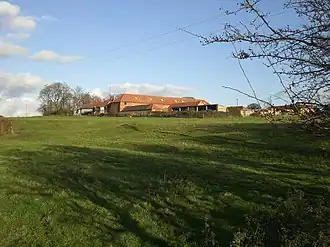 South-west of the modern trackway, the medieval main street runs through what was a green (shown on the map of 1714) of width about 32 metres (105 ft). East of the green, there is a north-west facing scarp, height about 2 metres (6 ft 7 in), the area above the scarp being divided by two discernable trackways, of width about 6 metres (20 ft), running towards existing farm buildings to the east. There are enclosures between the trackways. West of the green, there is a chain of later ponds; west of these, parts of three homesteads can be discerned. The remaining traces of these, in an adjoining field, have been lost by ploughing, but have been recorded by aerial photography.[1]