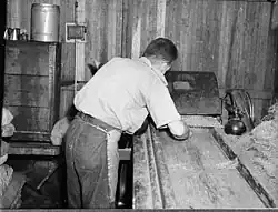 Its existing corrugated asbestos roof sheeting replaced an original corrugated iron roof c.1940.[5] There is no ceiling lining and the underside of the roof cladding forms the ceiling.[5][1]