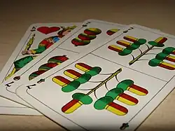 In Bavaria, the most common form of the game uses three permanent top trumps called "Criticals". It is primarily a game for four players, with the partnered pairs of players sitting opposite one another across the card table. It is usually played with a German-suited Bavarian or Franconian pattern pack, each player being dealt five cards. The aim for each pair is to win three tricks per hand.