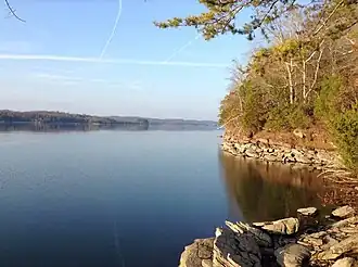 Watts Bar Reservoir is located in the U.S. state of Tennessee about midway between the cities of Chattanooga and Knoxville. It begins as the Tennessee River below Fort Loudoun Dam (35°47′30″N 84°14′34″W / 35.79167°N 84.24278°W / 35.79167; -84.24278 (Fort Loudoun Dam)) in Lenoir City, Tennessee and stretches 72.4 miles (116.5 km) to Watts Bar Dam (35°37′15″N 84°46′55″W / 35.62083°N 84.78194°W / 35.62083; -84.78194 (Watts Bar Dam)), near Spring City, Tennessee. The Clinch River connects to the main channel of the lake at mile 568 (35°51′50″N 84°31′50″W / 35.86389°N 84.53056°W / 35.86389; -84.53056 (Clinch River mouth)) near Southwest Point (site of Andrew Jackson and John Sevier's 1803 confrontation[1]) in Kingston, Tennessee. The widening of the Clinch by the lake makes that river navigable all the way up to Melton Hill Dam (35°53′5″N 84°18′0″W / 35.88472°N 84.30000°W / 35.88472; -84.30000 (Melton Hill Dam)), which is equipped with a navigation lock allowing navigation upstream through Oak Ridge and Clinton. The partially navigable Emory River connects with the Clinch near the TVA's Kingston Steam Plant just upriver from the meeting with the Tennessee. Including the Clinch and Emory arms, Watts Bar has 722 miles (1,160 km) of shoreline and over 39,000 acres (160 km2) of water surface. Minor tributaries include Poplar Creek, Caney Creek, and White's Creek. The lake contains several large islands, most notably Thief Neck Island, Long Island, and Sand Island.