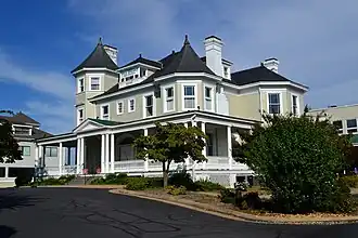 Described as "opulent," the 2+12-story house is arranged with a square main section to the front, with a rear service wing. The front, on the west side of the house, is sheltered by a full-width single-story porch that wraps partway around the north and south sides. The main entry is a pair of doors with a fanlight transom. The interior features a center hall plan with a monumental stair offset to one side. The stair features a stained glass Palladian window on the landing between the first and second floors. The expansive central hall is flanked by drawing rooms, a dining room, and a smaller parlor. The rear wing houses service areas with servant quarters on the second floor. The main house is isolated from the servants' quarters on the second floor. A turret on the attic level is the only finished room on the third floor.[3]