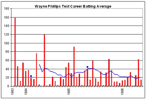 Phillips scored 66 for South Australia against NSW in a McDonalds Cup game and 33 in a Shield game. In the second test he opened in the first innings scoring 7, then was put down the order for the second innings, making 13; this led to David Boon opening with Geoff Marsh for the first time.[96][97] Phillips missed a chance off Srikkanth in the first innings when the batter was 61 (he scored 86). In the second innings he missed two easy stumpings off the bowling of Ray Bright, Gavaskar on 8 and Kris Srikkanth on 35, causing Allan Border to come to Phillips' defence: "I feel sorry for Wayne", he said. "He's had a couple of bad tracks to keep on. He feels he is letting down the side. But I hope we stick with him. I don't believe there is a 'keeper in the country capable of doing any better." However Trevor Grant of The Age declared, "let us accept that asking him to keep wickets was a mistake that did not work."[98] Australia were fortunate to escape with a draw for the match.