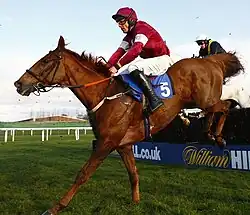 His first notable win came in the 2009 Spa Novices' Hurdle, a Grade 1 National Hunt race held at Cheltenham Racecourse in Cheltenham, Gloucestershire during the Cheltenham Festival. In that race, Weapon's Amnesty held off 17 other competitors, including jockey Ruby Walsh on Pride of Dulcote, whom he narrowly beat by a half of a length.[5][6] After the win, Davy Russell said of Weapon's Amnesty: I was definitely on the best horse in the race and didn't want to hit the front too soon. Charles has done a fantastic job with this horse, because he is not the easiest to train. He's a big-framed horse and a chaser in the making.[7]