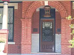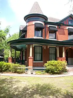 Queen Anne-style houses are not often constructed of brick, but this one is, with brick laid in common bond. The house also shows Colonial Revival influences.[2]