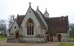 Four official wedding photos taken by Benjamin Wheeler were released in the two days following the ceremony. Two of them were taken in front of the chapel following the wedding service, and the bride's paternal grandparents, the Queen and the Duke of Edinburgh, appeared in one of them at a distance. The ceremony marked the first time that the Queen and Prince Philip had attended a family event after the lockdown.[27] The ceremony was followed by an intimate reception at Royal Lodge, the Duke of York's official residence, to which 14 of the couple's friends were invited. A marquee "filled with sofas, a jukebox, draft beer and a dartboard" was set up outside and guests stayed in glamping pods until the next morning.[28][29] The Duke of York is said to have delivered a speech at the reception.[30]