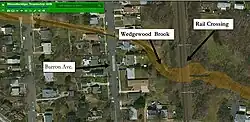 The brook arises near Woodbridge High School, flows east, and crosses Wedgewood Avenue, Amboy Avenue and Barron Avenue before entering Woodbridge River in the Woodbridge River Park. Interest in the brook has increased as it has had recurrent flooding in recent years. Woodbridge is bordered on the east by the Arthur Kill, into which the Woodbridge River flows. There is a history of tidal flooding along this river and its tributaries. Woodbridge rivers have been described as having a "high flow, flashy nature;" in addition to tidal flooding, fluvial flooding is also common. The land is relatively impervious, and flooding is exacerbated steep slopes, urban cover and outflow block. The twin culvert size at the railroad crossing just downstream from Barron Avenue is 4x4 feet; this leads to severe upstream flooding. It is estimated that a 100 year flood will put the area under nine feet of water and affect 42 homes.[1] Frequency of flooding has increased over time. Residential areas moved into previous marsh land, decreasing the ability of the land to absorb excess water. Wedgewood Brook is the northern boundary of the area most affected from Hurricane Sandy, Watson-Cramptom. Prior to 2009 this area was zoned for high density residential housing, including the area consisting of wetlands and meadows.[2] When the Sandy came, there was a combination of tidal and fluvial flooding; it was "characterized as a tsunami-like water wall," destroying adjoining homes.[3] After Sandy, using money from the New Jersey Buyout Program,[4] Woodbridge bought out and demolished many residential properties in the flood hazard areas.[5] Woodbridge's actions and plans have been called a "slow motion evacuation from climate change." As people move out of flood hazard areas, they will replaced by a "floodplain forest of native trees, shrubs and grass."[6] In Woodbridge not everybody wants to sell; 2050, when the properties may be under water, seems too far in the future for some.[7] This interferes with the goal of land buffers, entire blocks, between rivers and homes.[8]