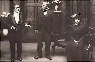 Grossmith went on to appear in plays by playwrights such as Henry Arthur Jones and Jerome K. Jerome, opposite actors such as Herbert Beerbohm Tree at the Haymarket Theatre and with Mrs. John Wood at the Court Theatre.[8] In 1892, he played in W. S. Gilbert's Rosencrantz and Guildenstern, a parody of Hamlet, at the Royal Court Theatre. He became known for playing comedy character roles, noting, "I am almost invariably cast for cowards, cads and snobs", and he was particularly good at portraying harassed, misunderstood little men as, like his brother George, he was small in stature.[4] The Times wrote that the "Weedon Grossmith" part had become a recognised feature of current drama.[5]