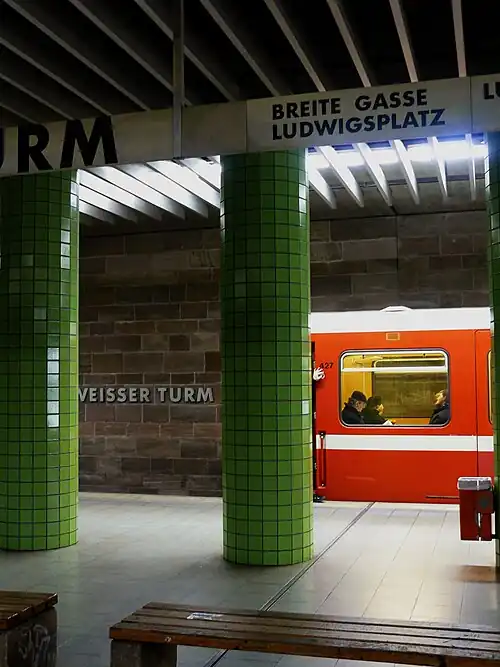 Weißer Turm station is a Nuremberg U-Bahn station, located on the U1 line. Located in the south-western part of Nuremberg's historical city and at the western end of the pedestrian-only shopping district. It serves as a destination for shoppers and shop employees during the day and provides transportation to the amusement venues (primarily bars and restaurants) located in the vicinity during the evenings. Like all subway stations in Nuremberg, it opens at about 5 am and closes at about 1 am Mondays to Sundays.