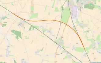 At the beginning of the line in Leckwitz near Weißig, it separates at grade from the Leipzig-Dresden railway line, which at this point has four tracks, each suitable for operations at 130 km/h (2,500 m radius).[3] From there, the line runs for 7.425 kilometres north of Strießen, Priestewitz and Kottewitz through the Großenhainer Pflege. North of Priestewitz the line crosses the Großenhain–Priestewitz railway and east of Kottewitz it connects at a grade-separated junction with the Dresden–Elsterwerda (Berlin–Dresden) line, which is designed for speeds of 200 km/h (6,000/7,000 m radius). The track running from Dresden to Leipzig is carried on a 160 m long flying junction over the Berlin–Dresden line. In its course, the line also crosses national highway 101 and has a total of six railway bridges.[4][5] The embankments have a height of up to 9 m.