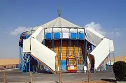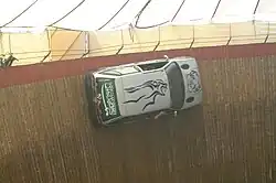 The wall of death, motordrome, velodrome[3] or well of death is a carnival sideshow featuring a silo- or barrel-shaped wooden cylinder, typically ranging from 20 to 36 feet (6.1 to 11.0 m) in diameter and made of wooden planks, inside which motorcyclists, or the drivers of miniature automobiles and tractors travel along the vertical wall and perform stunts, held in place by friction[4] and centrifugal force.