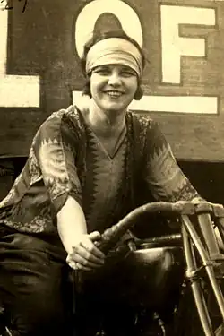 Derived directly from United States motorcycle board track (motordrome) racing in the early 1900s, the very first carnival motordrome appeared at Coney Island amusement park (New York) in 1911. The following year portable tracks began to appear on travelling carnivals. By 1915 the first "velodromes" with vertical walls appeared and were soon dubbed the "Wall of Death," the very first mention being Bridson Greene's unit in Buffalo, New York.[5] Although not a silo-drome, the large combination motordrome at the 1915 Panama Pacific International Exposition included a perfectly vertical section at the top that was used by both car and motorcycle riders.[6]