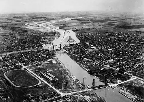 1930 Overview of Welland showing Bridge 13 in the distance with the third canal Alexandra Bridge relocated to Division Street just in front of it. The nearer vertical lift bridge is Bridge 14 (Lincoln Street)