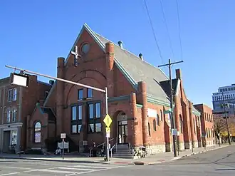 In 1980, the Welsh Presbyterian Church was listed on the National Register of Historic Places, qualifying because of its architecture.[1] Its significance derives partly from its location, as almost no 19th-century structures have survived in its immediate vicinity, and comparable examples of Romanesque Revival architecture are rare in downtown Columbus.[2] The building became home to Faith Mission,[4] a homeless shelter affiliated with Lutheran Social Services, in 1989.[5] The shelter operated in the space until 2012, when it traded the church building to the Edwards Cos. for a larger warehouse nearby, where the shelter operates today. The Edwards Cos. redeveloped the space, utilizing historic tax credits, to become a leasing office and community space for the Normandy apartment complex.[6]