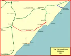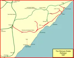 The line was a little over four miles long; by the end of 1880 a demonstration goods train was run, but the line was not properly finished, and the Board of Trade inspection took place on 30 July 1881, by Major General Hutchinson. With some qualifications, the line was passed as fit for passenger operation, and it opened formally on 1 August 1881 although public services did not start until 8 August.[6] It was worked by the North British Railway.[7] There were intermediate stations at West Wemyss (at the present-day Standing Stane Road) and Wemyys Castle, close to the town of East Wemyss. It had private accommodation for Wemyss and his family.