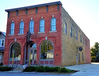 The two-story structure has side and rear walls of rubble limestone with a brick facade.[2] The decorative elements of the Italianate style building features brick arches with dressed limestone keystones, recessed brick panels, and brick pilasters.[2] The bracketed cornice on the top is a recreation added during the building's restoration in the 1980s.