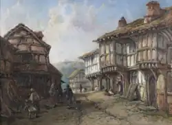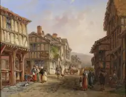 The Market Hall (demolished in the 1860s)[61] was a fine timber-framed building allegedly erected by John Abel (1578–1675), and located on the south-east corner of the marketplace infill. It had a large upper chamber over an open ground floor, supported by ornately carved timber posts.[62] A drawing of it survives by Joseph Murray Ince 1839, which is now at the Rhode Island School of Design Museum in the USA.[63] Also, paintings by William Pitt of the mid 19th century feature it.[64]