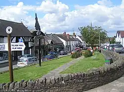 The historical layout of the settlement, on which the majority of the old buildings stand, is in the form of an inverted T. The crossbar of the T is the High Street, and the stem is the funnel-shaped mediaeval marketplace comprising a triangular area abutting the High Street and extended to the north by the aptly-named Broad Street. The triangle used to have a row of infill buildings, but these were demolished in the mid 20th century and replaced by a small urban park called the Rose Garden.[11] The west side of the former marketplace is called Portland Street, and the south side is Market Pitch.