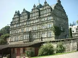These aristocratic designs were not only embraced by the lesser nobles; middle-class builders also copied the new forms of building in order to show off their growing social influence. Town halls, like those in Celle and Lemgo, were designed with gables along the sides and sometimes faced with an entire renaissance façade, as occurred in Bremen. From Nienburg, to Minden, Hamelin and Höxter, Hannoversch Münden and Einbeck magnificent townhouses appeared, that were often distinguished by their great gateway into the inner hall. Other important architectural features of the Weser Renaissance style are the ornately decorated gables, the use so-called Bossenquader or bossage stone, the alcoves (Standerker, Ausluchten or Utluchten) and double windows.[3]