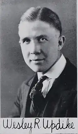 Wesley Russell Updike was born on February 22, 1900, in Trenton, New Jersey, to Virginia (Blackwood) Updike, a Missouri native, and Rev. Hartley Titus Updike, a Princeton educated Presbyterian minister, who suffered employment difficulties due to a throat ailment.[1] Updike had an older brother, Archibald. and sister, Mary. As a child Updike had to wear braces due to malnutrition-related developmental issues. In high school he suffered an injury while hauling newspapers and had to leave school, but a donor allowed him to return and attend St. Stephen's Episcopal Boarding School (later known as Bard College). During World War I Wesley Updike served as a private in the Student Army Training Corps from October 30, 1918, until December 13, 1918.[2] Wesley Updike enrolled at Ursinus College in Pennsylvania in 1919 on a football scholarship and was a chemical-biological major.[3]