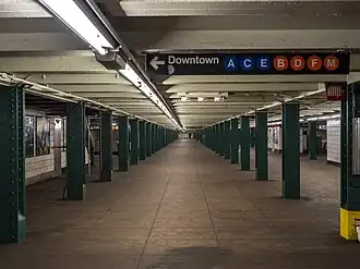 The Eighth Avenue Line's express tracks are used by the A at all times except late nights, while the Eighth Avenue Line's local tracks are used by the A at night,[57] the C at all times except late nights,[58] and the E at all times.[59] The Sixth Avenue Line's express tracks are used by the B on weekdays during the day[60] and the D at all times.[61] The Sixth Avenue Line's local tracks are used by the F at all times, the <F> during rush hours in the peak direction,[62] and the M on weekdays during the day.[63] The next stop to the north is 14th Street/Sixth Avenue for Sixth Avenue local trains, 34th Street–Herald Square for Sixth Avenue express trains, and 14th Street/Eighth Avenue for all Eighth Avenue trains. The next stop to the south is Broadway–Lafayette Street for all Sixth Avenue trains, Spring Street for Eighth Avenue local trains, and Canal Street for Eighth Avenue express trains.[64]